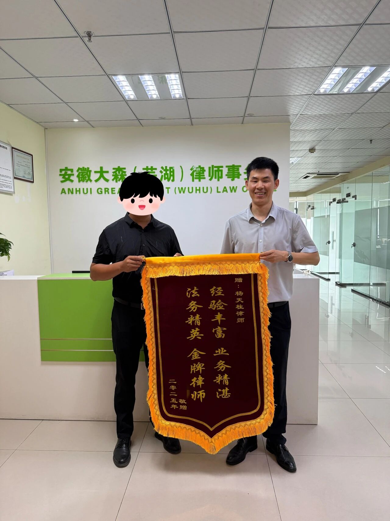 9月10日,安徽大森(芜湖)律师事务所的杨天柱律师收到了当事人赠送的一面绣有“经验丰富 业务精湛,法务精英 金牌律师”的锦旗。