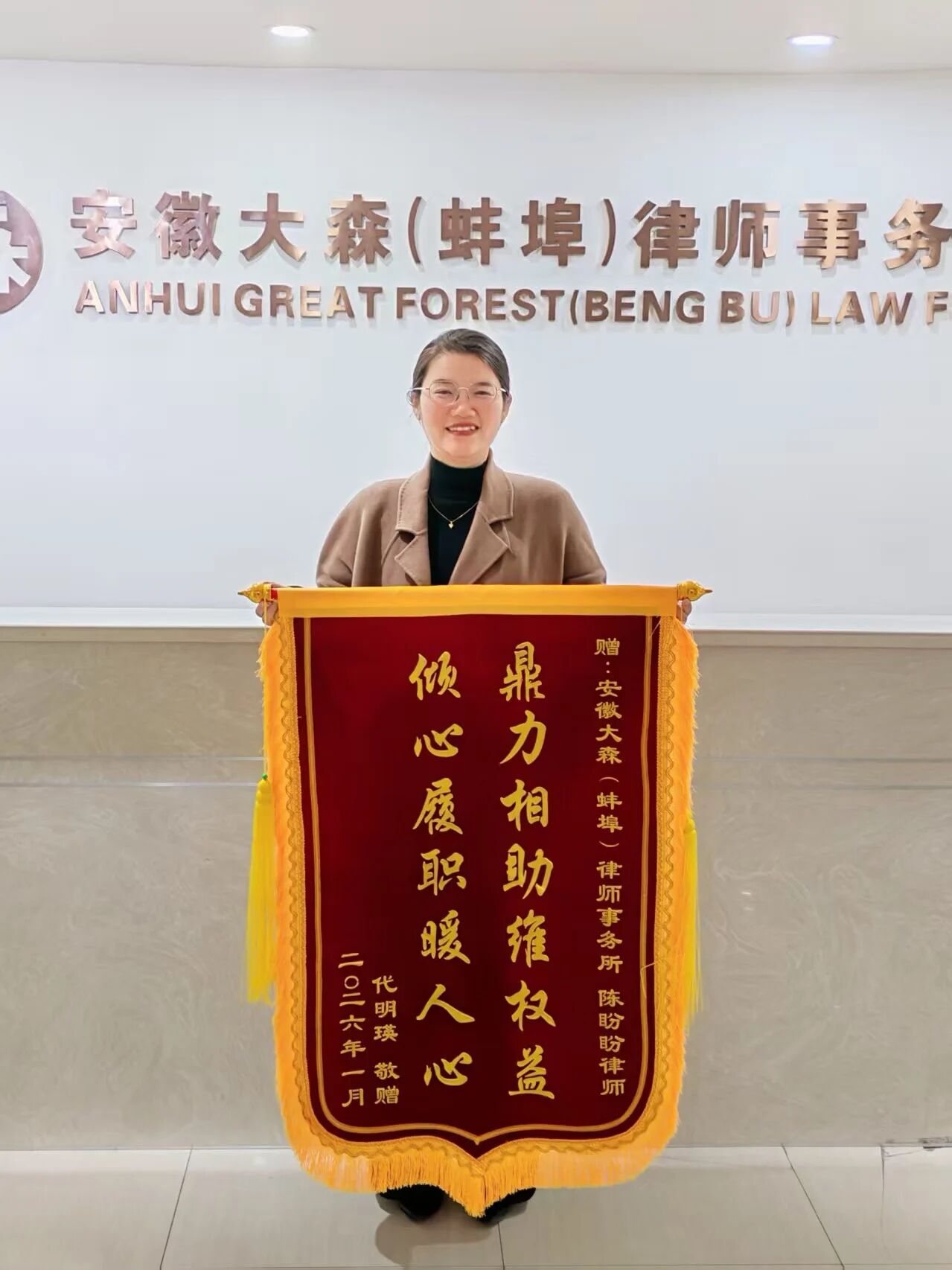 近日,大森律师事务所鲁晨晨律师收到一面写着“专业敬业律法精湛、尽心尽责不负重托”的锦旗,